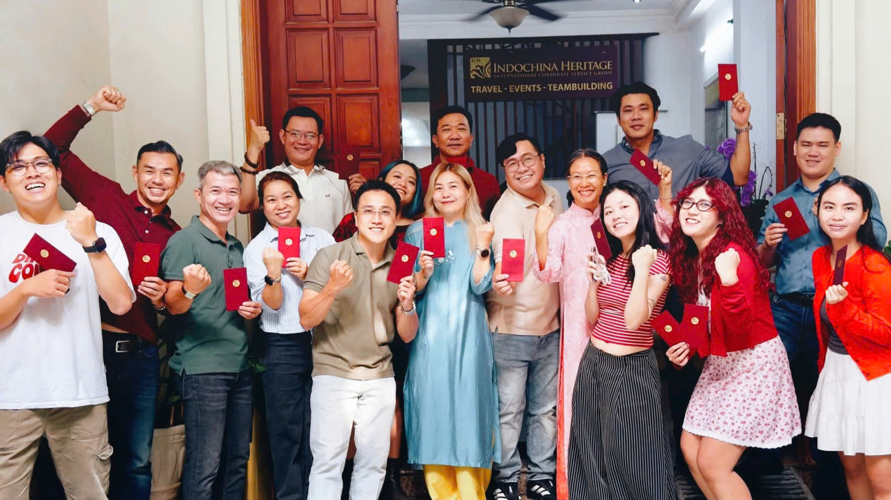 Tet 2026 001 Published February 24, 2026 at 1803 × 1013 in Tet 2026 001 Indochina Heritage Team with the red envelops for fortune, on the First Working Day after Tet (24 February 2026).← Previous